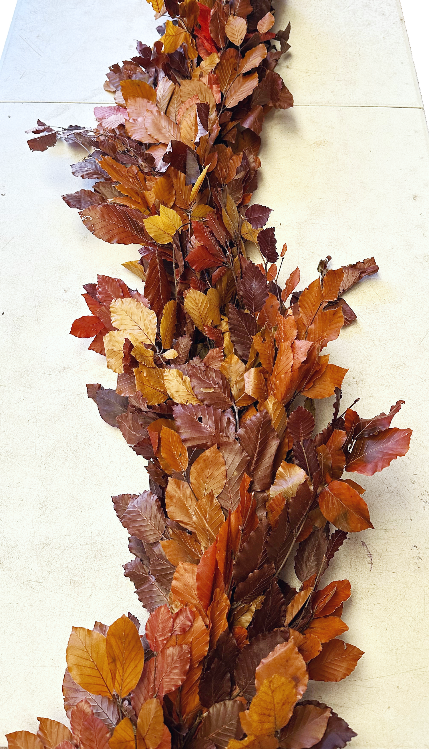 Elevate your fall décor with our exquisite preserved copper beech foliage garland. Rich sienna, amber, and russet leaves create a warm, dimensional runner that feels both luxurious and natural—perfect for autumn tablescapes, Thanksgiving mantels, and fall weddings. Each garland is meticulously handcrafted for a full, layered look that photographs beautifully and adds instant seasonal sophistication.