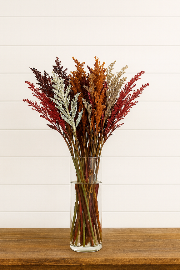 Add the warmth and vibrancy of autumn to your floral creations with our Preserved Solidago Fall Assorted Stems. These beautifully preserved bunches feature a mix of rich fall tones β from golden yellows and burnt oranges to deep burgundy and rustic browns β making them the perfect accent for seasonal arrangements, wreaths, centerpieces, and DIY dΓ©cor projects.